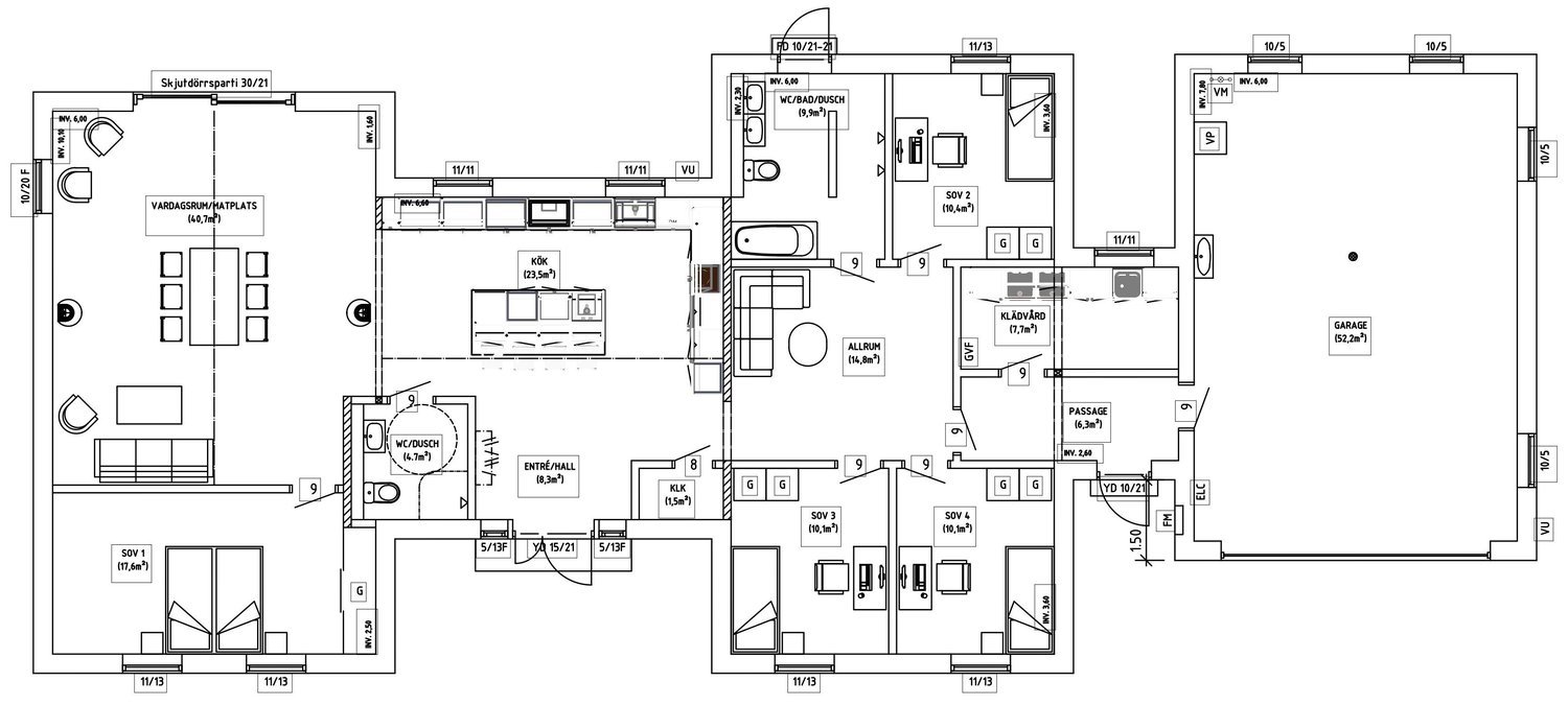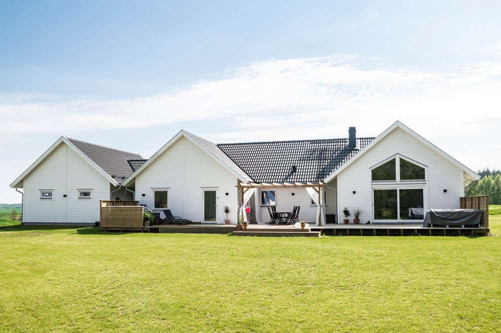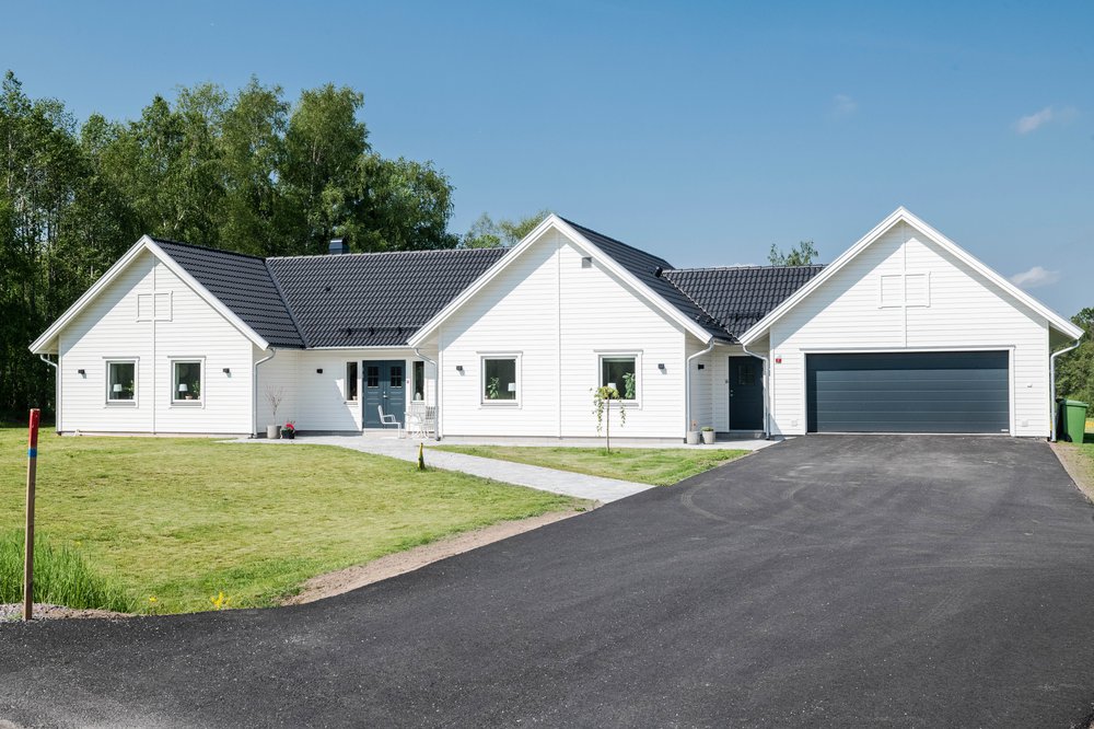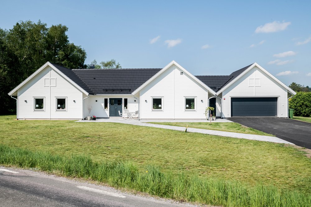 En rejäl 1-plansvilla med 3 stora husknoppar, varav stort dubbelgarage bildar en av husknopparna. På baksidan bildar två av husknopparna en mysig "innergård" perfekt för mysiga middagar.